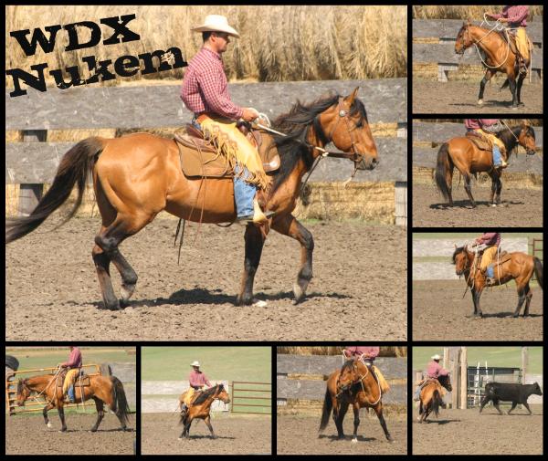 | Nuke has been used all his life for any job that needed done on the ranch. He will get down in the ground a turn with a cow and has drug calves, roped yearlings, started colts and tagged calves with all levels of riders. His colts are guaranteed to be the gentlest and friendliest you've ever been around. They are born "people horses" and their curiosity and desire to please make them exceptionally easy to halter break and start under saddle. |